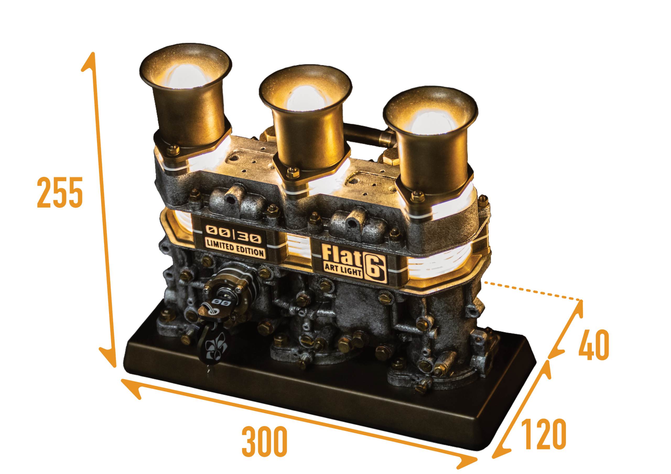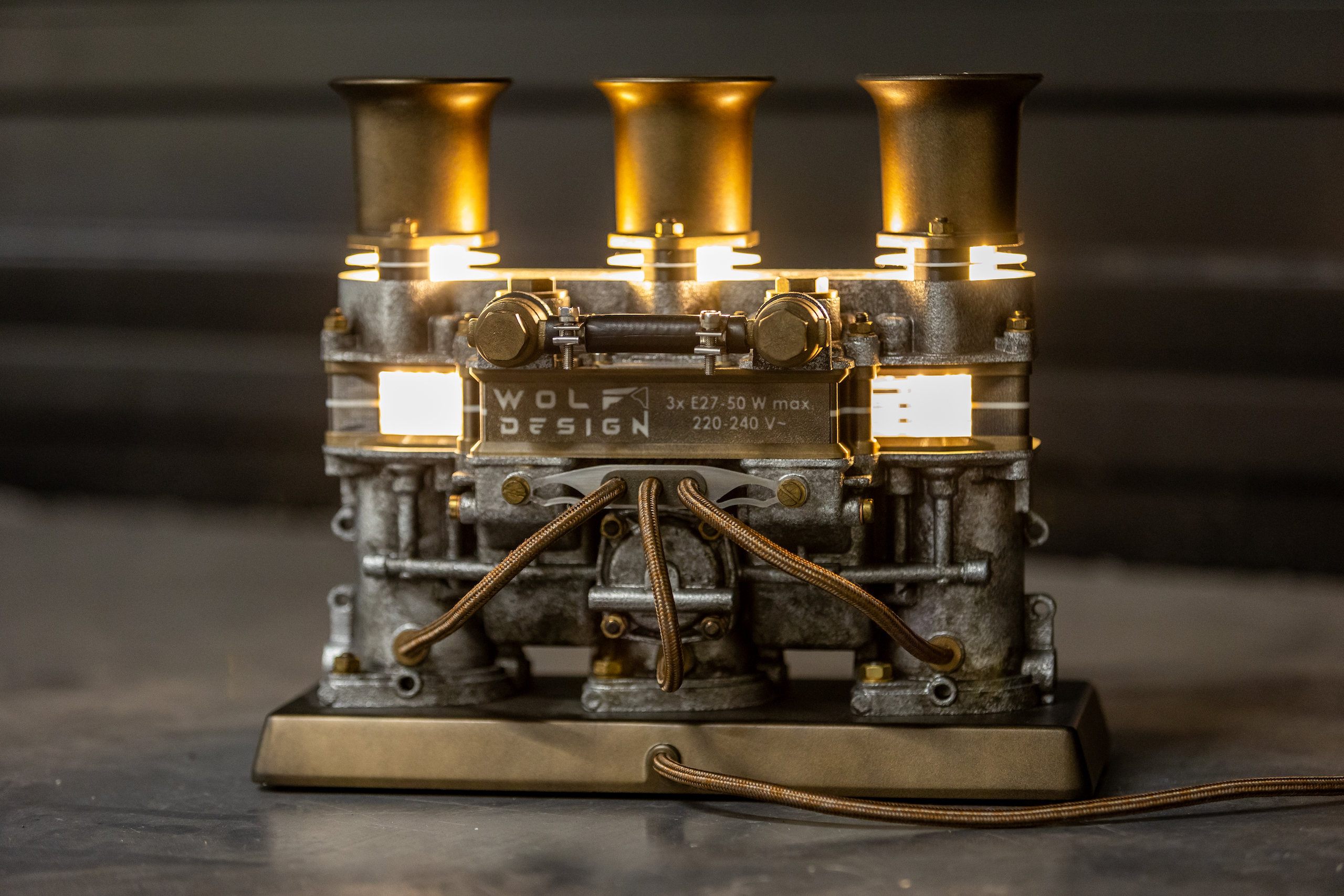 Inspirée d’un carburateur de Porsche 911, cette lampe en impression 3D, ornée de cornets effet bronze vieillis et d’une patine soigneusement travaillée, affiche un look usé au caractère affirmé – signé WOLF DESIGN.